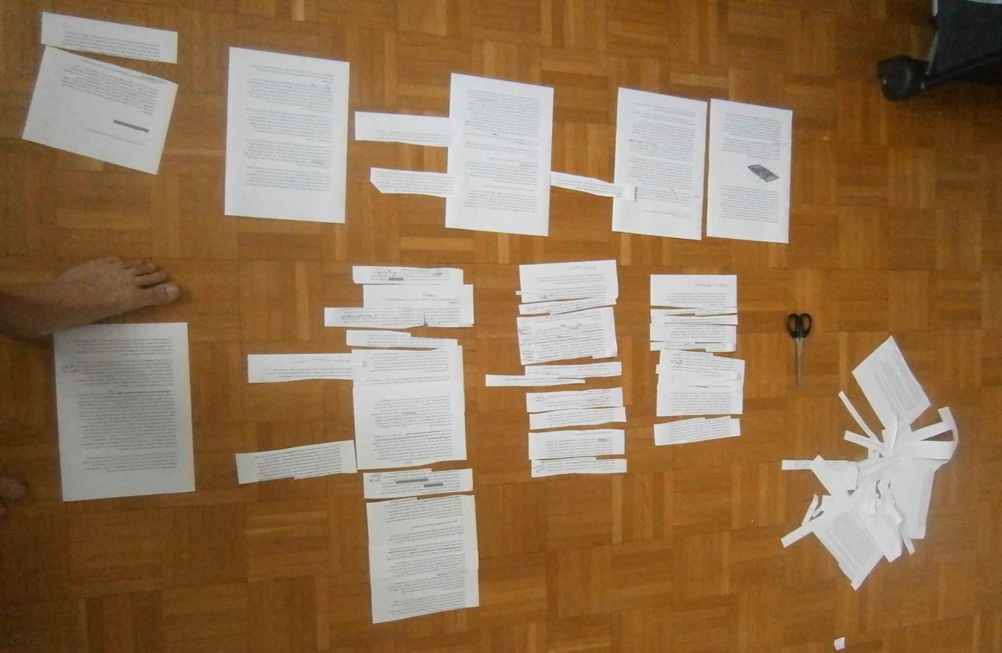 Seit nunmehr zwei Wochen arbeite ich an einem Text über das neue Schubhaftzentrum Vordernberg, in der Steiermark. Der Text beruht auf einem längeren Gespräch, das ich mit einem der Architekten geführt habe: Michael Anhammer, von SUE Architekten, die 2010 den EU-weiten Wettbewerb für diess Schubhaftzentrum gewonnen haben. Es ist eine unglaublich schwierige Aufgabe, diesen Text in Form zu bringen, bei der Sache zu bleiben, zu dokumentieren und nicht vorschnell oder gar persönlich zu werten; und zugleich aber auch nicht nur in der technisch-architektonisch-administrativen Welt von “Lösungen” zu verharren. Nun aber drängt der Abgabetermin immer mehr, und ich brauche tatsächlich auch eine gute “Lösung”; es bleibt wie auch bei kniffeligen Roman-Kapiteln nur noch die physische Bearbeitung mit der Schere.